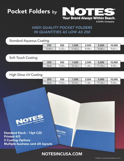 - Soft Touch Coating or High Gloss Spot UV available for offset printed folders.
